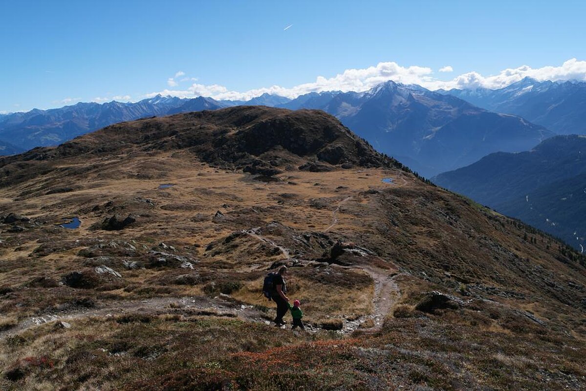 Der Weg zum namensgebenden Gipfel des Gebiets, dem Rastkogel, ist ebenfalls einfach. In gut 3,5 Stunden geht es an malerischen Bergseen vorbei und durch unberührte Natur über alpine Wiesen. Die letzten Meter zum Gipfel sind schroff und oben angekommen, möchte man meinen, man steht auf einem der ganz Großen in den Alpen. Der Rundumblick vom Rastkogel ist spektakulär und zeigt den Zillertaler Hauptkamm. Besonders den Olperer sieht man von hier aus von seiner Schokoladenseite. Nach Osten geht der Blick zu den Hohen Tauern und im Norden breitet sich das Karwendel aus. Die Wanderung zum Rastkogel hat es auch ins Jubiläumstourenbuch des DAV geschafft, in dem die 150 schönsten Touren beschrieben werden.
