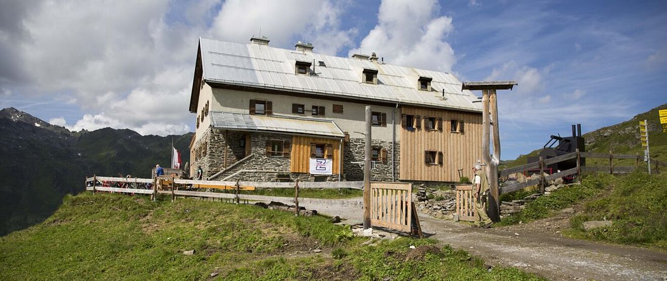 Die Rastkogelhütte (2.124m) liegt in einem geschwungenen Almtal oberhalb von Hippach im Zillertal und ist auch gut mit ÖPNV erreichbar. Abseits der sonst allgegenwärtigen Liftanlagen und Hotelbauten kann man hier den Blick über die Almwiesen und Berge schweifen lassen. Der Hüttenparkplatz an der Zillertaler Höhenstraße liegt an der Baumgrenze, so dass die 250 Höhenmeter bis zur Hütte in einer guten Stunde zu bewältigen sind. Der Zustieg ist über ein Wirtschaftsweg der Almbauern möglich, welcher auch als Mountainbikeroute dient. Wir empfehlen den abseits verlaufenden schmalen Wander-Pfad durch die blühenden Almwiesen. Auf diesem langsam ansteigenden Panoramaweg bieten einige kleine Bäche und kleinere Felsen viel Abwechslung, sodass auch mit Kindern der Zustieg kurzweilig ist.
